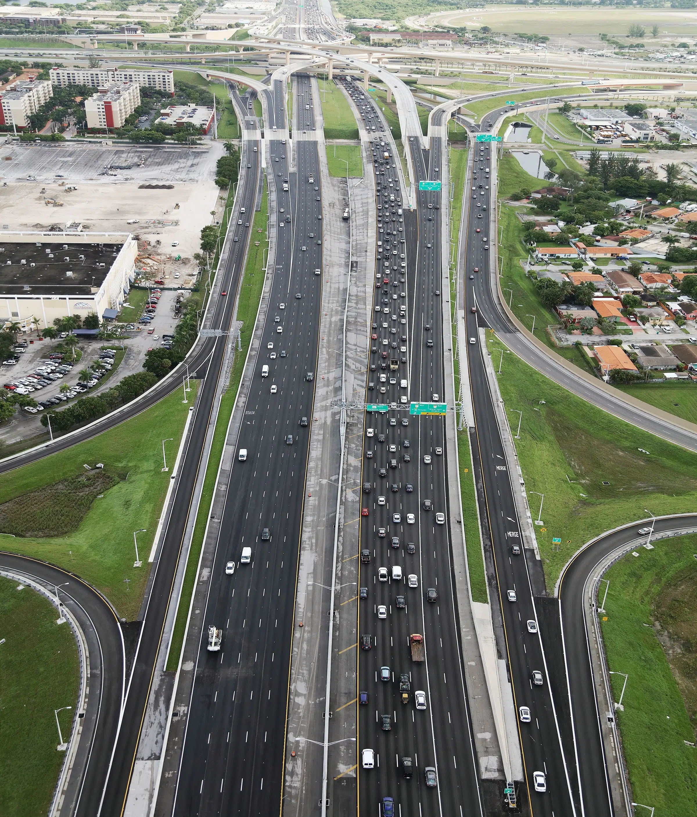 In the heart of Miami-Dade County, this $559 million-dollar design-build project, known as Palmetto Section 5, consisted of the reconstruction of one of the busiest interchanges in Florida. With over 500,000 vehicles traversing the facility on a daily basis, it took skilled coordination and oversight to build this four-level system-to-system interchange consisting of 47 bridges, including four segmental directional flyover ramps. The launching gantries used for bridge construction became a symbol of this great project and of the ingenuity of our team, allowing us to build the project without shutting down the facility.
